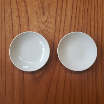 神具のお皿を紹介します。 左 釉薬 右 素焼き 釉薬のお皿は汚れにくく一般的に広く使用されています。 素焼きは光沢がなくザラザラした表面で落ち着きを感じることができます。 当店は素焼きのお皿も6㎝か39㎝(2寸~1尺3寸)まで取り扱い、注文を受け付けております。 釉薬のお皿は4.5㎝(1.5寸)から取り扱っております。